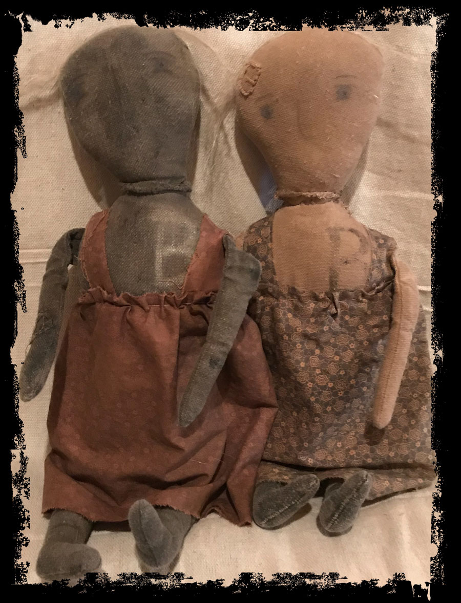 How old and prim is she!! This great doll is appx 18". She is tattered and wearing a faded dress (fabrics will vary). Flax hair and drawn on face. Wonderful primitive piece. Available body color Black or White. Price is for one.