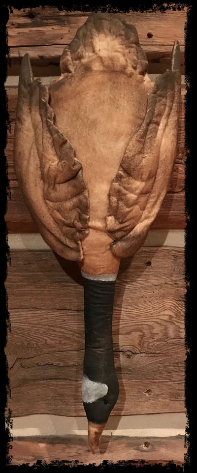 This primitive hanging goose is so amazing! The aging is very prim! Appx 23”-25" tail to beak. Would look great hanging by the fire or laying on a wood cutting board. The neck is filled with rice to give it a floppy look - like the real thing. Would be awesome hung in a bunch of 3-4.